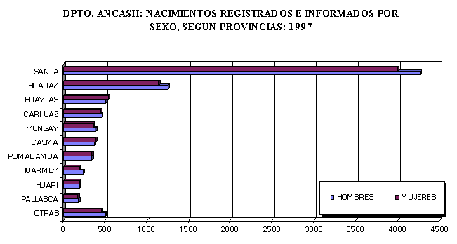 En 1997 las Oficinas de Registro Civil del departamento de Ancash, han registrado e informado al Instituto Nacional de Estadística e Informática 16,917 nacimientos de los cuales 8,702 (51.4%) son hombres y 8,215 (48,6%) son mujeres.