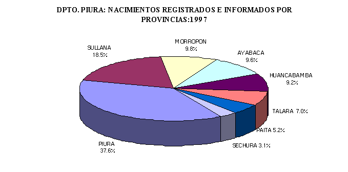 2.5 Estado Conyugal El 57 por ciento de las mujeres en edad fértil del departamento de Piura, viven en estado de unión conyugal: formalmente casadas el 38% y en situación de convivencia el 19 %. Entre 15 y 19 años, 9 de cada 10 mujeres son solteras, a los 24 años, cerca de la mitad (47%) vive en unión conyugal. Después de los 40 años, menos del 6% de mujeres permanece soltera. Entre 15 y 49 años, el 35% del total de mujeres en edad fértil son solteras. En el departamento de Piura el 7% de las mujeres en edad fértil, han disuelto su unión conyugal, por divorcio o separación; entre 20 y 24 años existe un 6% de mujeres separadas y por encima de los 40 años alrededor del 8% de las mujeres son divorciadas o separadas. 3. Estadísticas Vitales En 1997 las Oficinas de Registro Civil del departamento de Piura, han registrado e informado al Instituto Nacional de Estadística e Informática 36,806 nacimientos de los cuales 18,454 (50,1%) son hombres y 18,352 (49,9%) son mujeres. También se ha registrado 5,007 matrimonios, 65 divorcios y 5,040 defunciones de los cuales 2,654 (52,7%) son hombres y 2,386 (47,3%) mujeres. Las provincias que han informado tener un mayor número de nacimientos son: Piura con 13,824 (37,6%) del total, seguido de Sullana con 6,813 (18,5%) y Morropon con 3,603 (9,8%), mientras que las provincias que han tenido menor número de nacimientos son las provincias de Paita con 1,924 (5,2%) y Sechura con 1,155 (3,1%) nacimientos.