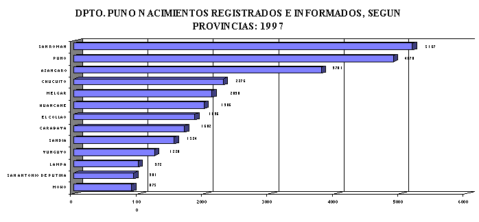 Las provincias que registraron un mayor número de matrimonios fueron: Puno con 957 (23,9%), San Roman 539 (13,5%) y Azángaro con 501 (12,5%), mientras que las provincias que registraron menor número de matrimonios son Sandia 100 (2,5%) y San Antonio de Putina con sólo 54 (1,3%). Cabe destacar que las Oficinas de Registro Civil del departamento de Puno no registraron divorcios para el año de 1997. Las provincias que registraron mayor número de defunciones fueron: Puno con 1,487 (16,1%), Azangaro 1,368 (14,8%) y San Roman con 1,098 (11,9%), mientras que las provincias que han tenido menor número de defunciones son las provincias de Moho con 334 (3,6%) y San Antonio de Putina con 314 (3,4%) defunciones. | |||||||||||||||||||||||||||||||||||||||||||||||||||||||||||||||||||||||||||||||||||||||||||||||||||||||||||||||||||||||||||||||||||||||||||||||||||||||||||||||||||||||||||||||||||||||||||||||||||||||||||||||||||||||||||||||||||||||||||||||||||||||||||||||||||||||||||||||||||||||||||||||||||||||||||||||||||||||||||||||||||||||||||||||||||||||||||||||||||||||||||||||||||||||||||||||||||
