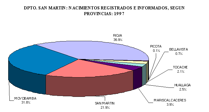 2.5 Estado Conyugal El 72 por ciento de las mujeres en edad fértil del departamento de San Martín, viven en estado de unión conyugal: formalmente casadas el 39% y en situación de convivencia el 33 %. Entre 15 y 19 años, 7 de cada 10 mujeres son solteras, al concluir los 24 años, el 69% vive en unión conyugal. Después de los 40 años, el 1% de mujeres permanece soltera. Entre 15 y 49 años, cerca de la cuarta parte (22%) del total de mujeres en edad fértil son solteras. En el departamento de San Martín el 5% de las mujeres en edad fértil, han disuelto su unión conyugal, por divorcio o separación; entre 20 y 24 años existe un 3% de mujeres separadas y por encima de los 40 años alrededor del 8% de las mujeres son separadas. 3. Estadísticas Vitales En 1997 las Oficinas de Registro Civil del departamento de San Martín, han registrado e informado al Instituto Nacional de Estadística e Informática 7,811 nacimientos de los cuales 3,945 (50.5%) son hombres y 3,866 (49,5%) son mujeres. También se ha registrado 909 matrimonios y 867 defunciones de los cuales 506 (58,4%) son hombres y 361 (41,6%) mujeres. Las provincias que han informado tener un mayor número de nacimientos son: Rioja con 2,881 (36,9%) del total, seguido de Moyobamba con 2,485 (31,8%) y San Martín con 1,709 (21,9%), mientras que las provincias que han registrado menor número de nacimientos son las provincias de Tocache con 167 (2,1%), Bellavista 54 (0,7%) y Picota con 10 (0,1%) nacimientos.