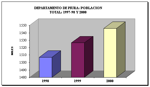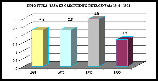 Aunque la tasa de crecimiento anual ha bajado sistemáticamente de 2.3% a 1.7% según los censos de 1940 y 1993 respectivamente, las cifras absolutas revelan que en los últimos 5 años la población del Departamento de Piura creció en aproximadamente 16 mil habitantes cada año.