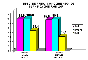 Las encuestas demográficas, principalmente la serie de ENDES, revelan que el conocimiento de alguna forma de regulación de la fecundidad es prácticamente universal entre los piuranos. En efecto, en 1996, el 96.4% del total de mujeres en edad fértil conocen o han oído de por lo menos un método y aún en el área rural este porcentaje es de 95.3%.